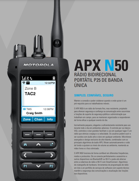 O APX N50 é um rádio de formato fino, mas resistente, projetado para oferecer segurança e confiança na comunicação entre socorristas, equipes de suporte e administração da segurança pública que trabalham em campo. Ele tem layout simples, áudio alto, criptografia de hardware MACE e recursos eficientes de programação em lote para manter a conexão e a colaboração da sua frota, a qualquer hora, em qualquer lugar.