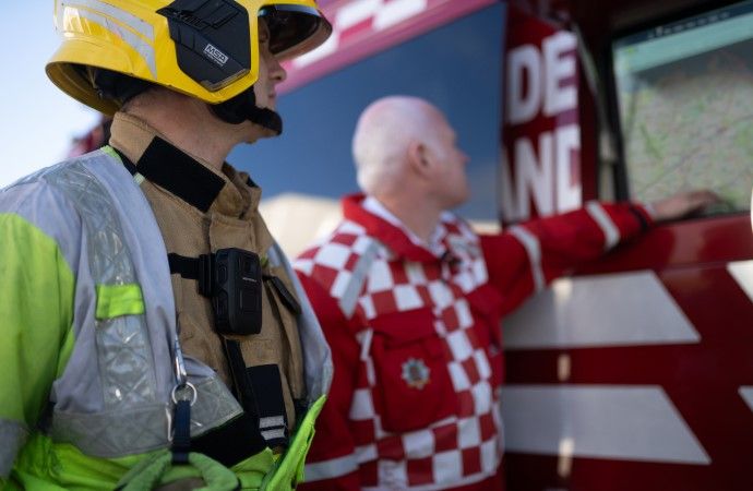 Os bombeiros podem fazer transmissões de vídeo ao vivo para uma sala de controle durante um incidente ou capturar imagens para comprovar a conformidade com normas.