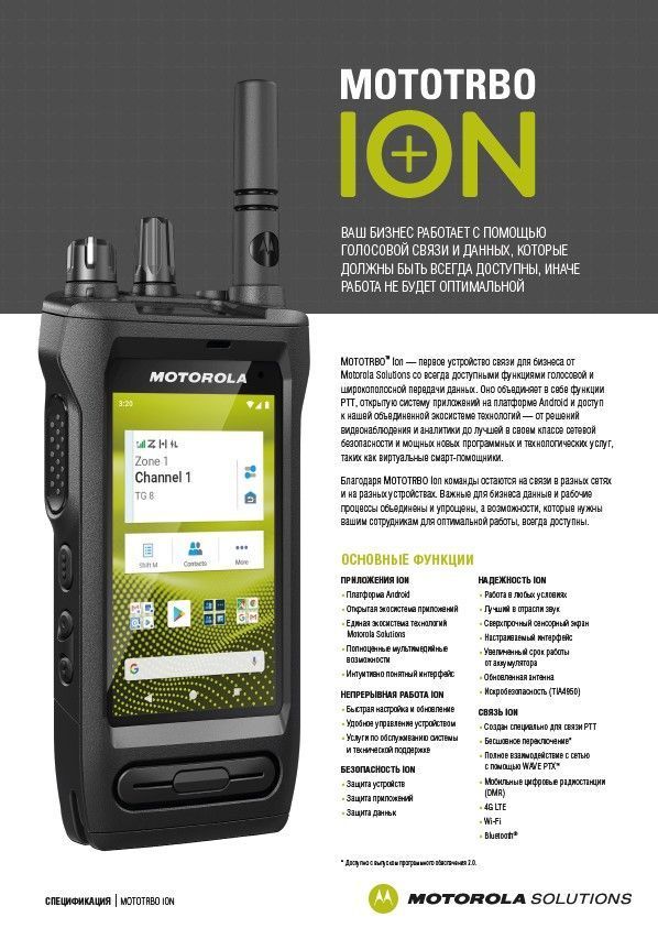 MOTOTRBO Ion объединяет в себе функции PTT, открытую систему приложений на платформе Android и доступ к нашей объединенной экосистеме технологий ― от решений видеонаблюдения и аналитики до лучшей в своем классе сетевой безопасности. Оставайтесь на связи с помощью Ion в разных сетях и на разных устройствах. Важные данные и рабочие процессы объединены и упрощены, а возможности, которые нужны вашим сотрудникам для оптимальной работы, всегда доступны