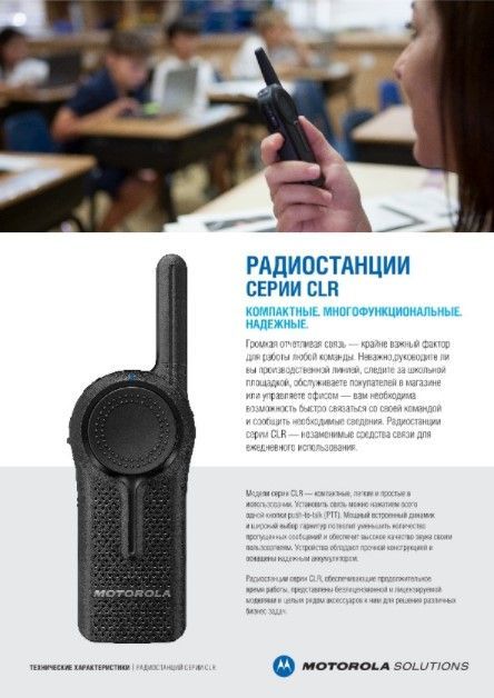 Компактные, легкие и простые в использовании модели серии CLR позволяют мгновенно установить связь нажатием одной кнопки с помощью функции push-to-talk (PTT). Более громкий и чистый звук из встроенного динамика или совместимых гарнитур уменьшит количество пропущенных сообщений и обеспечит четкую связь между пользователями. Все эти характеристики заключены в устройство с прочным корпусом и долговечным аккумулятором.