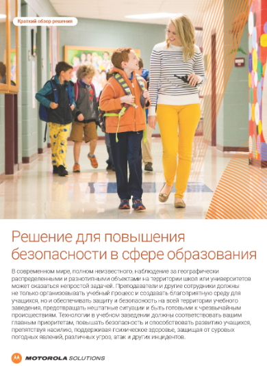 Мы помогаем сделать учебные заведения более безопасными, создавая лучшие технологии для каждого сегмента экосистемы защиты и безопасности, чтобы ничто не угрожало учащимся, сотрудникам, зданиям и транспортным средствам. Это устройства и сети связи, системы видеонаблюдения и решения для объединения голосовой связи, видео и данных в одном представлении.