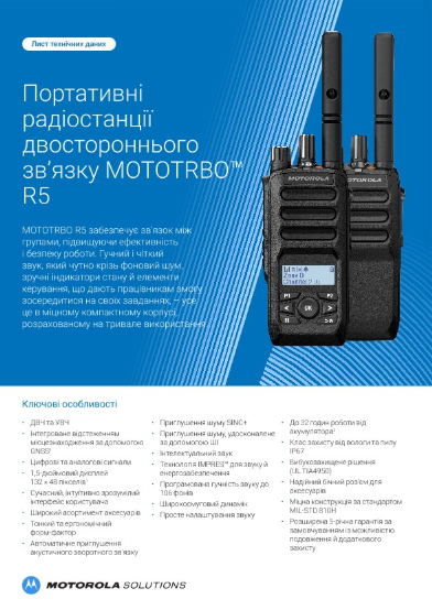 Завдяки гучному звуку, удосконаленій функції приглушення шуму, зрозумілими індикаторам стану й спеціальному обладнанню для керування MOTOTRBO R5 забезпечує надійний зв’язок між групами й допомагає підвищити ефективність і безпеку співробітників. А завдяки класу захисту IP67 та MIL-STD-810 R5 корпус достатньо міцний, щоб витримувати удари й падіння під час повсякденного використання.