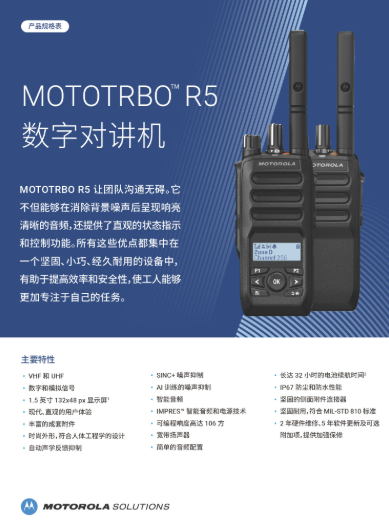 凭借响亮的音频、先进的噪声抑制、清晰的状态指示以及专用硬件控制功能,MOTOTRBO R5 可以确保实现可靠的团队沟通,帮助提高工人的效率和安全性。IP67 和 MIL-STD-810 等级的设计赋予 R5 足够的坚固性,能够承受日常使用中的撞击和跌落。